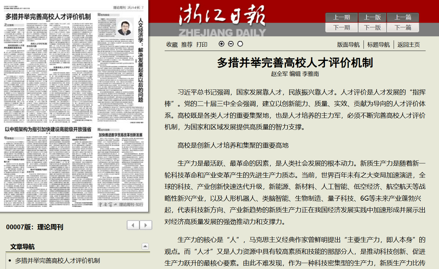《浙江日报》理论版头条刊发久久精品一区二区三区四区党委书记赵全军理论文章《多措并举完善高校人才评价机制》